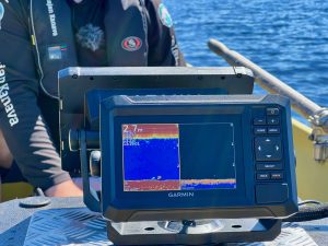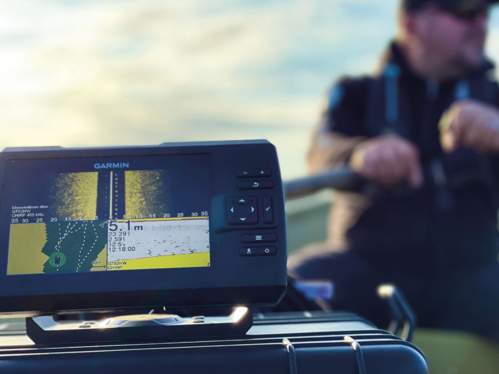Toinen vaihtoehto tässä hintaluokassa on pykälää pienemmällä näytöllä, mutta varsinaisella karttaplotterilla varustettu peruskaikuluotain Garmin Echomap UHD2 52cv. 5-tuumainen vaakanäyttö riittää hyvin avovesille ainakin pienempään veneeseen. Näytön kaveriksi valikoitui peräpeilanturi GT20, joten kaikuluotaimelta nähdään ”peruskalakaiun” eli 2D-luotaimen avulla perinteiset kalakaaret. Kalat erottaa vielä tarkemmin alaspäin näyttävän ClearVü-luotaimen avulla. Käytössä on syytä vain huomioida, että näytön koon takia kalastettaessa on hyvä käyttää 2D- tai ClearVü-näkymää. Liikuttaessa veneellä näyttöön kannattaa vaihtaa karttaplotterinäkymä.