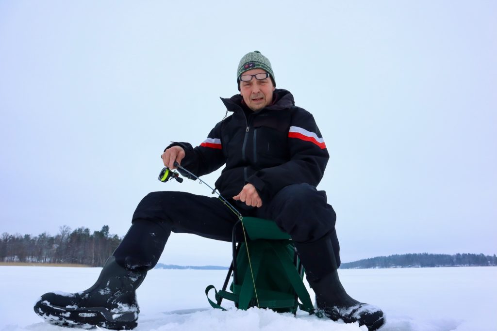 Kalastustoimittaja Jari Rannisto pilkillä. Tiukka katse luotaimeen: Kumpi narraa kumpaa hauki vai Jari?
