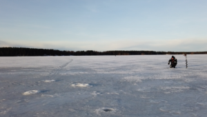 Kalastustoimittaja Jari Rannisto pilkillä. Tiukka katse luotaimeen: Kumpi narraa kumpaa hauki vai Jari?