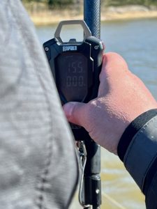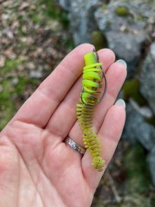 Viimeisenä päivänä kalastimme jopa vieläkin matalampaa vettä ja lisänä oli kova tuuli. Erikoisuutena oli myös se, että vedessä näkyvyys oli noin 5-10 cm. Siiman päähän päätyikin keltaista, oranssia, valkoista, mustaa, hyvin tummaa ruskeaa/mustaa. Ylisuurella dropshot-painolla sai jigit lentämään pahemmassakin tuulessa, mutta dropshot-nypytys sai olla silti suhteellisen hidasta ja pysäytykset pitkiä. Yksi viehe pärjäsi tässä olosuhteessa yli muiden. Se oli Bite of the Bleakin DFC Worm ja Coppertreuse värissä.