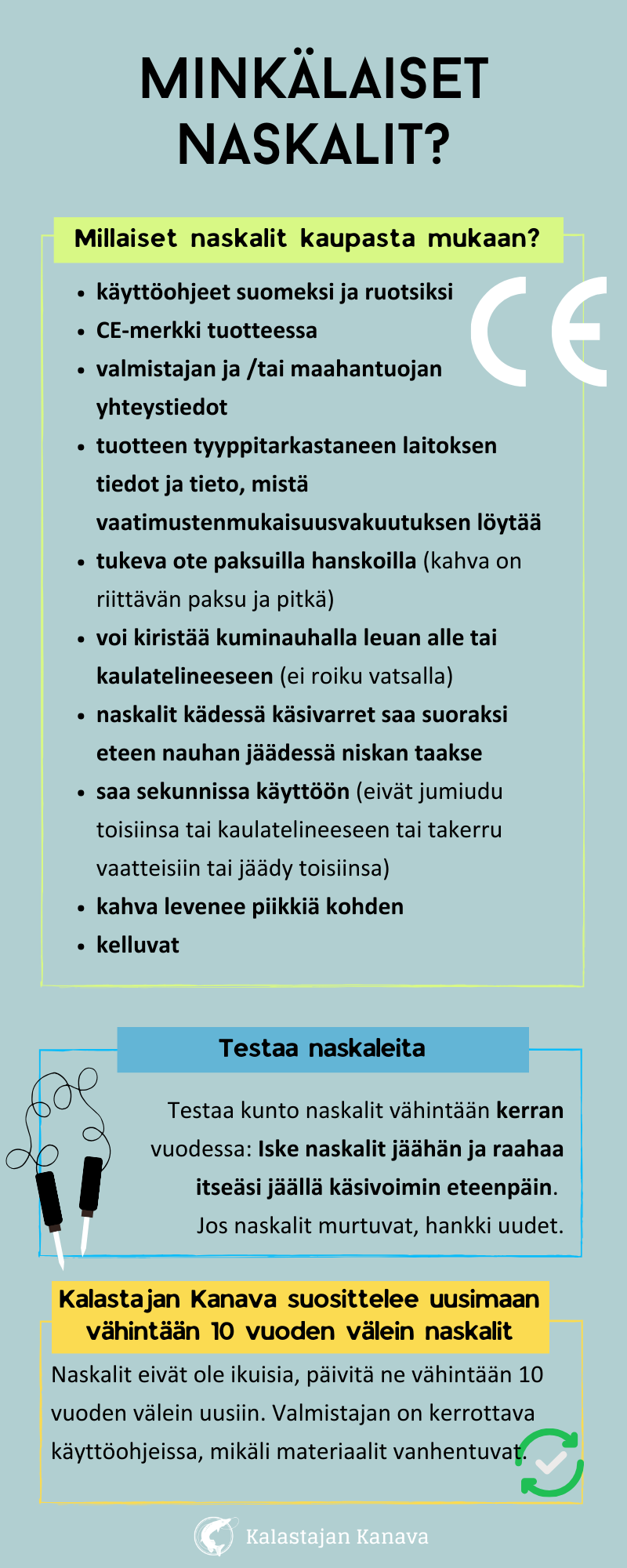 Suomessa hukkuu jäihin vuosittain keskimäärin 18 henkilöä ja näistä ainakin 20 % on hukkunut pilkkireissulla tai verkoilla. Kaikista jäihin hukkuneista on miehiä 87 % ja he olivat pääosin yli 60-vuotiaita. Merkittävä osa jäihin joutuvista voisivat pelastua, jos heillä olisi naskalit kaulallaan ja naskaleiden käyttöä olisi treenattu ennalta. Jäänaskalit ovat luokiteltu henkilösuojaimiksi, jotka on tyyppitarkastettava ilmoitetussa laitoksessa. Mistä tietää millaiset ovat turvalliset ja toimivat naskalit? Entä mitä muuta naskaleista on hyvä tietää?