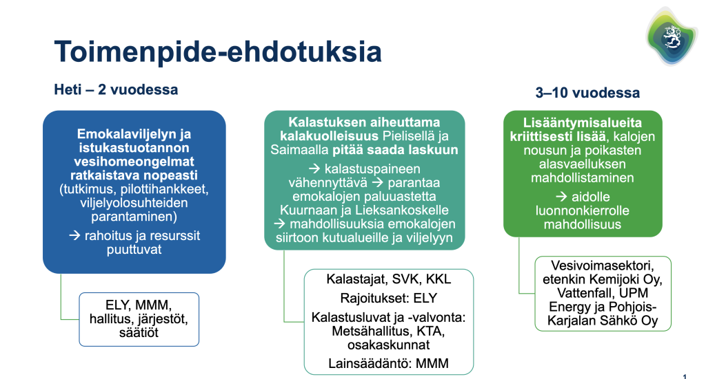 - olosuhteet ovat muuttuneet, joten vesilain mukaan voisimme arvioida vesivoiman osalta uudelleen kalatalousvelvoitteet kriittisissä kohteissa ja jos tämä ei tuota tulosta, voidaan vesilain nimissä harkita jopa pakkolunastuksia