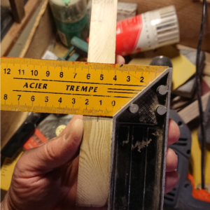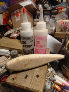 16. Koska mäntyaihio on suht kevyttä puuta, tarvitsee aihio reilusti painoa. Tällöin ei voi tehdä yhtä siistiä reikää, vaan porataan reiät merkityn kohdan kummallekin puolelle ja laitetaan mitattu määrä lyijyä paikalleen. Tähän voi käyttää tinaa, lyijyä, onkipainoja, ilmakiväärin kuulia, laakereita, yms. käytössä olevia, painavia materiaaleja.