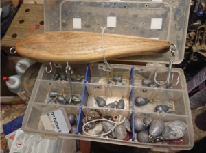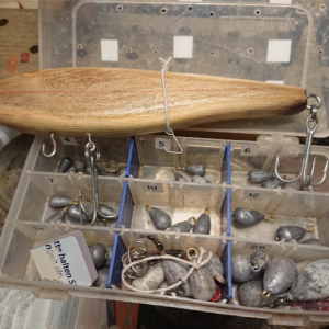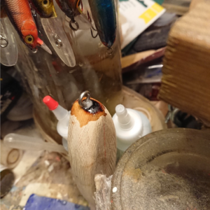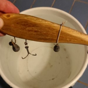 12. Jerkkiaihio on nyt painotuskunnossa. Suosin painotuksessa päärynäpainoja (joiden painon olen tarkistanut), avoimia ripustuslenkkejä (löytyy melkein kaikista rautakaupoista) sekä kumilangasta tehtyjä kumilenkkejä, joihin olen vääntänyt metallingasta koukun. Kun ryhdyt painottamaan aihiota, kiinnittä siihen myös oletuskoukut!