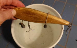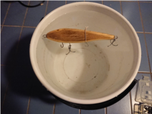 15. Painoa on riittävästi, kun aihio on vajonnut pohjaan! Nyt voit lähteä hakemaan sopivaa uppoamisnopeutta lisäämällä ja vähentämällä painoa kummastakin suunnitellusta painotuskohdasta. Muista, että aihion kelluvuus pienenee painoja varten porattujen reikien myötä.