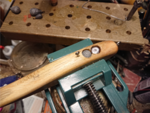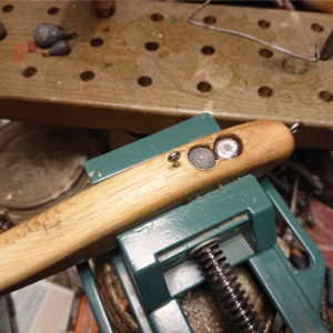 8. Varmista ennen liimaamista, että saat työnnettyä ruuvin riittävän syvälle! Täytä sitten ruuvikolo epoksilla ja sivele sitä myös ruuville ennen kiinnittämistä. Katso, että silmäruuvi menee sen verran syvälle, että lenkin alareuna peittyy liimalla.
