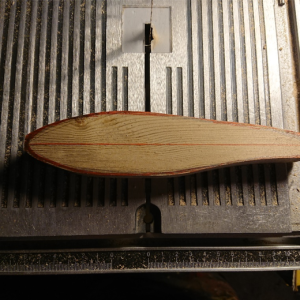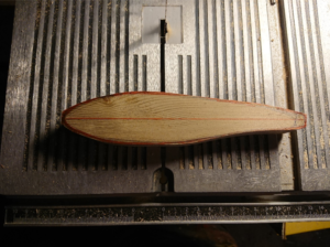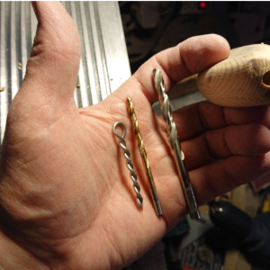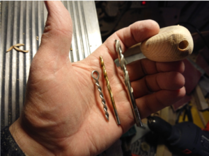 7. Poraa aihion keulaan ja perään reiät silmäruuvien liimaamista varten. Ensin ohuemmalla terällä (3,0-3,5 mm) tulevan mittainen reikä (mitataan kärjestä hiukan lenkin alareunaa syvemmälle) ja tämän jälkeen paksummalla (5,0-6,0 mm) terällä n. sentin reikä kumpaankin päähän.