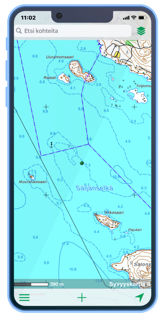 Karttaselain on ilmainen, mutta 39,99 €/12 kk Plus-tilaus tarjoaa käyttäjälleen runsaasti lisää toimintoja. Kalastajia ja vesillä liikkujia kiinnostavat esimerkiksi syvyyskartat, merikartat, reittien piirto ja mittaus. Karttaselain.fi osoitteessa tutustut ominaisuuksiin paremmin.