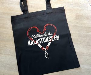 Kalastajan musta kangaskassi painatuksella on oiva lahja kalastuksesta pitävälle. Kassiin mahtuu hienosti vaikka kalastusreissujen eväät.