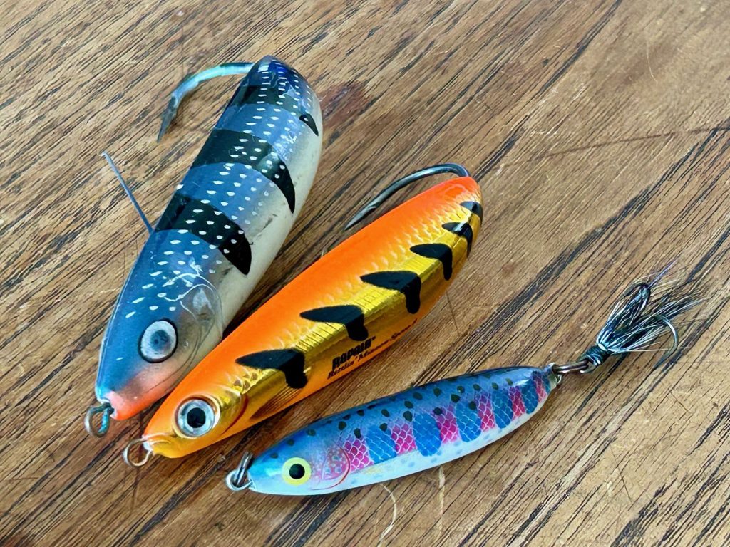 Oheisessa kuvassa kolme Weedless Shadia ja kolmantena vasemmalta Rattlin Minnow Spoon