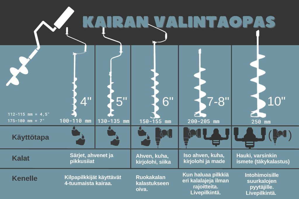 Jos kohdekalana on made tai hauki, niin homma on luonnollisesti aivan eri – matikkahommiin 8-tuumainen on passeli ja hauelle 10-tuumainen on suositeltava kairan koko. Modernissa ison hauen täkykalastuksessa eli ismetessä kymppi on jo miltei pakollinen valinta.