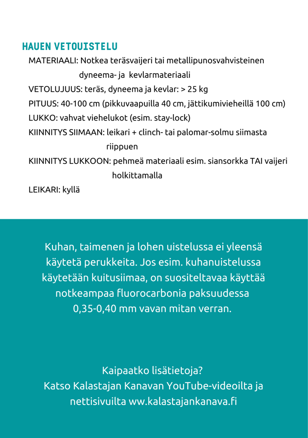 Hauenuisteluun peruke on välttämätön ja mittaakin sillä saa olla jopa 80 senttimetriä. Jos uistellaan haukea pienemmillä herkkäuintisilla vaapuilla, niin raskas teräsvaijeriperuke ei ole oikea valinta. Se tappaa pahimmillaan vieheen uinnin kokonaan. Tässä tapauksessa kannattaa ehdottomasti käyttää notkeita dyneemaytimisiä perukelankoja, paksuudessa 0,50–0,70 millimetriä. Näissä riittää kestoa isompienkin kohdekalojen väsyttelyyn. Haukiperukkeita kuitenkin kannattaa pitää silmällä ja tarkkailla niiden kuntoa jokaisen kalan jälkeen.
