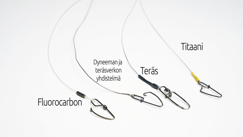 Tarjolla on myös erilaisia hybridimateriaaleja. Näistä tyypillisimpiä ovat dyneemaytiminen notkealla teräsverkolla pinnoitettu tai teräsytiminen ja joustavalla dyneemalla pinnoitettu solmittava materiaali. Nämä ovat kestäviä ja muistittomia. Tällainen soveltuu ohuessa paksuudessa jopa ahvenen tai kuhan jigaamiseen haukipitoisilla vesillä.