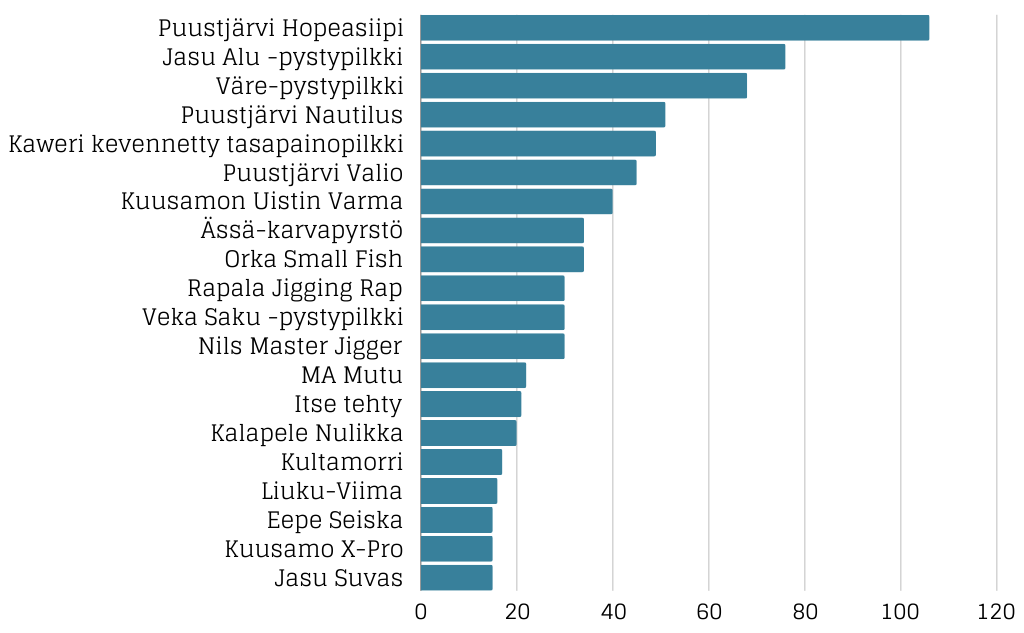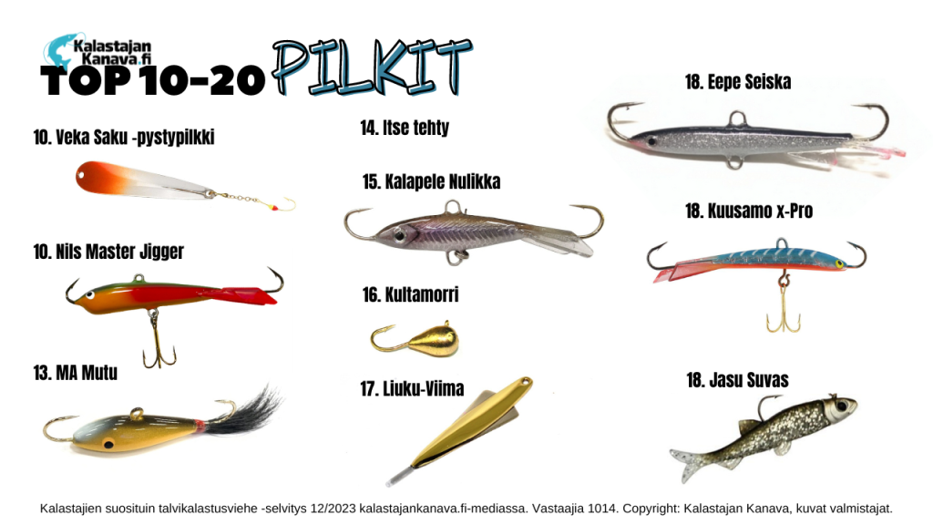 Kalastajien suosituin talvikalastusviehe -selvitys 12/2023 kalastajankanava.fi-mediassa. Vastaajia 1014. Kyselyssä ei otettu huomioon vieheiden eri kokoja tai värejä. Vieheen valmistaja ja malli olivat määräävät tekijät.