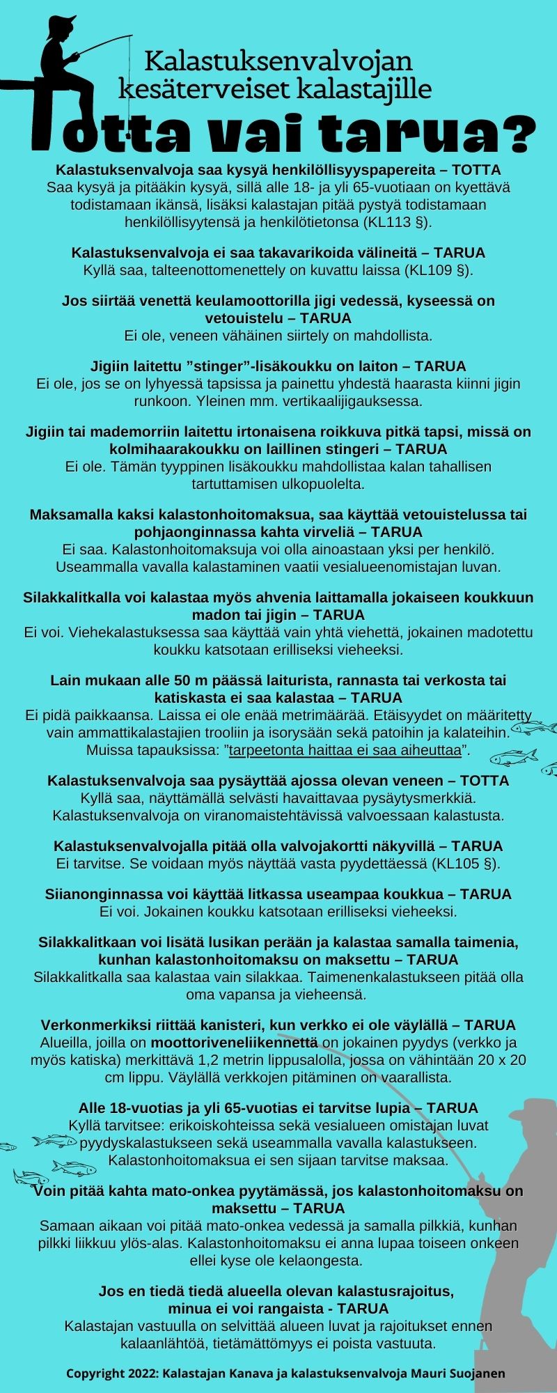 Kalastajalla on vastuu ottaa selville kalastusluvat ja –rajoitukset ennen kalaan lähtöä ja toimia niiden mukaan vesillä. Kun kalastaa muutoin kuin ongella, pilkillä tai litkalla silakkaa, on mukana lain mukaisesti oltava todistus kalastonhoitomaksun maksamisesta mikäli on 18-64-vuotias. Vuosimaksun maksajille toimitetaan sähköpostilla kalastuskortti, jonka voi tulostaa tai tallentaa puhelimeen, ja sitä voi käyttää todisteena maksusta. Myös kalastonhoitomaksun ostokuitti riittää todisteeksi.