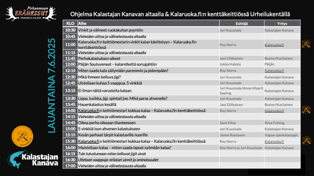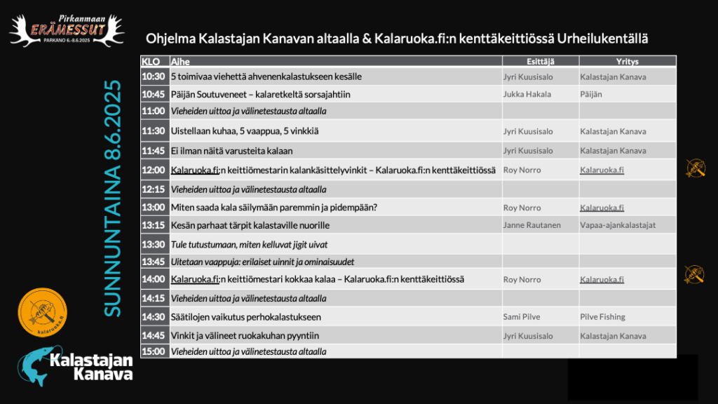 Sunnuntain 8.6.2025 ohjelmat Pirkanmaan Erämessuilla Kalastajan Kanavan altaalla ja Kalaruoka.fi:n kenttäkeittiössä.