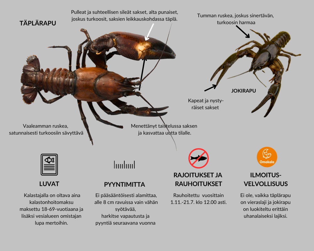 Täplärapu on nykyään valtaapitävä vesistöjemme rapulaji. Se on erittäin maukas äyriäinen ja kaupalliselle kalastukselle alueellisesti varsin merkittävä. Täplärapu on vieraslaji, jota istutettiin systemaattisesti Suomeen vasta 1980-luvulta lähtien. Nykyään sen istuttaminen on kiellettyä. Koska rapu on myös monen loppukesän suurta herkkua ja pyydettävissä kohtuu helposti kotikonstein, on lajiin hyvä tutustua tarkemmin. Vaikka ravut eivät ole kaloja, esittelemme tämän äyriäisen Viikon kalan nimissä sen ollessa juuri nyt sesongissa.