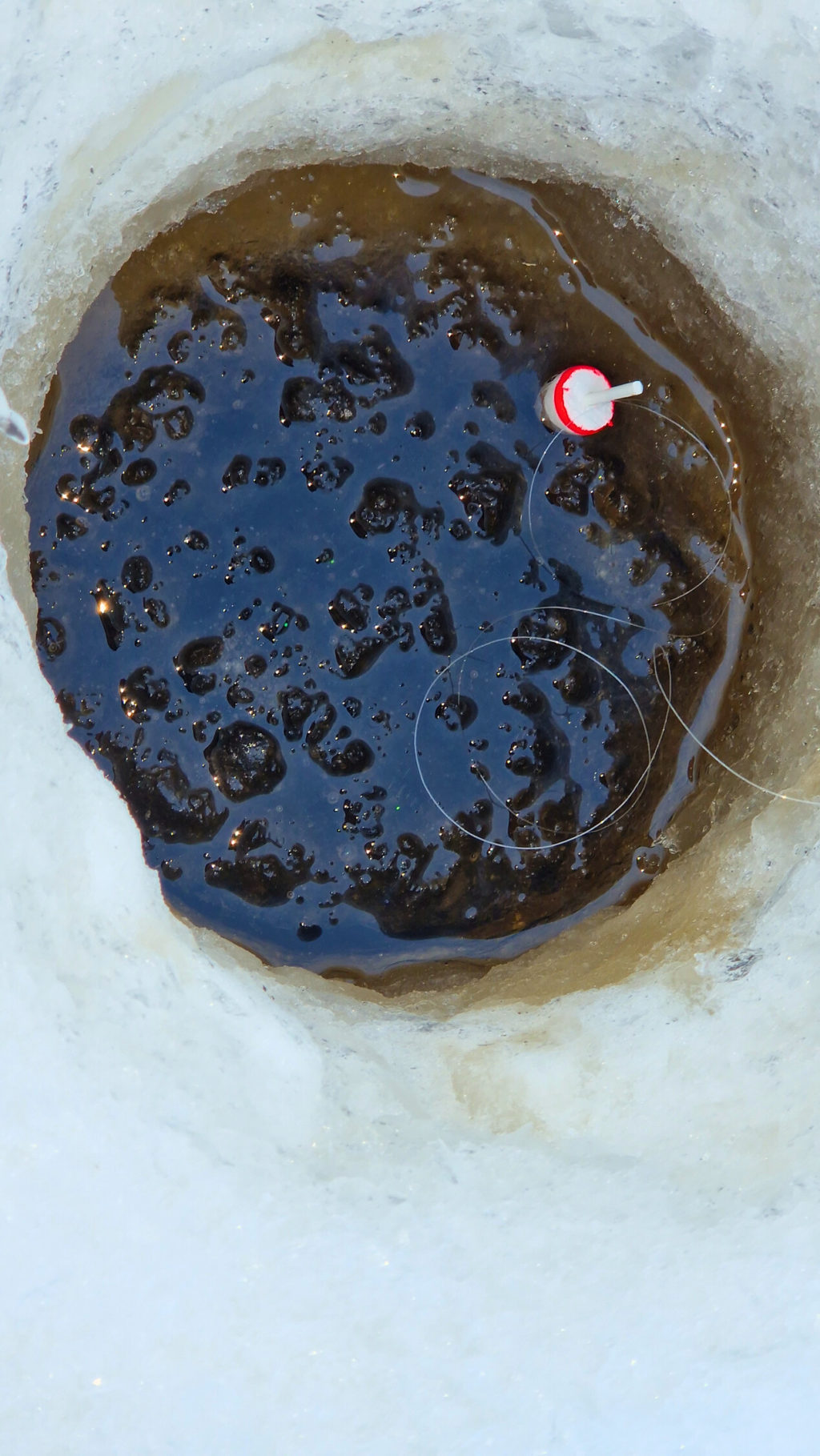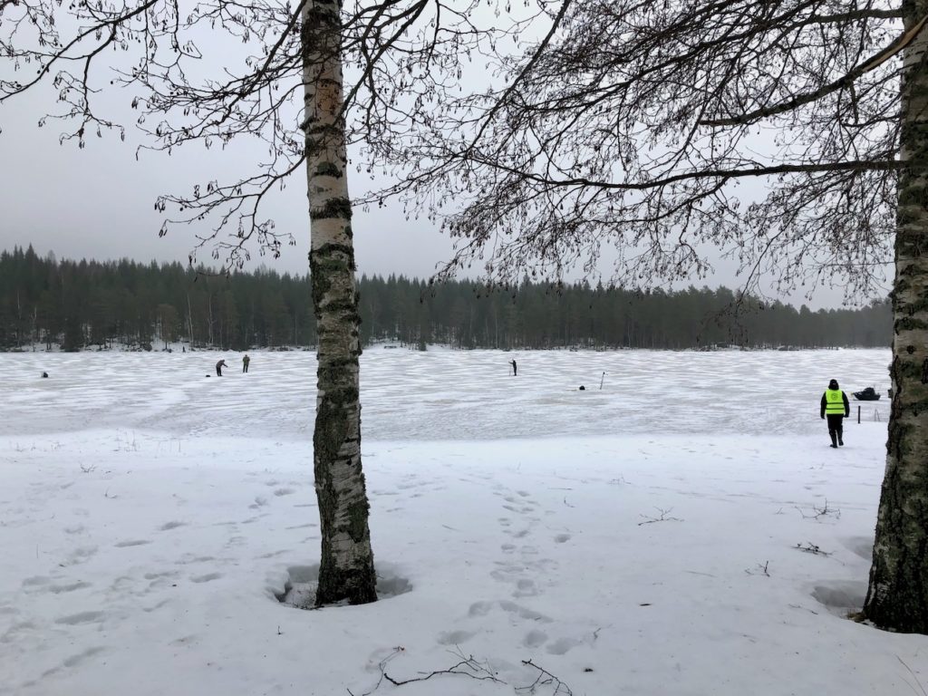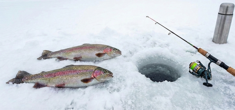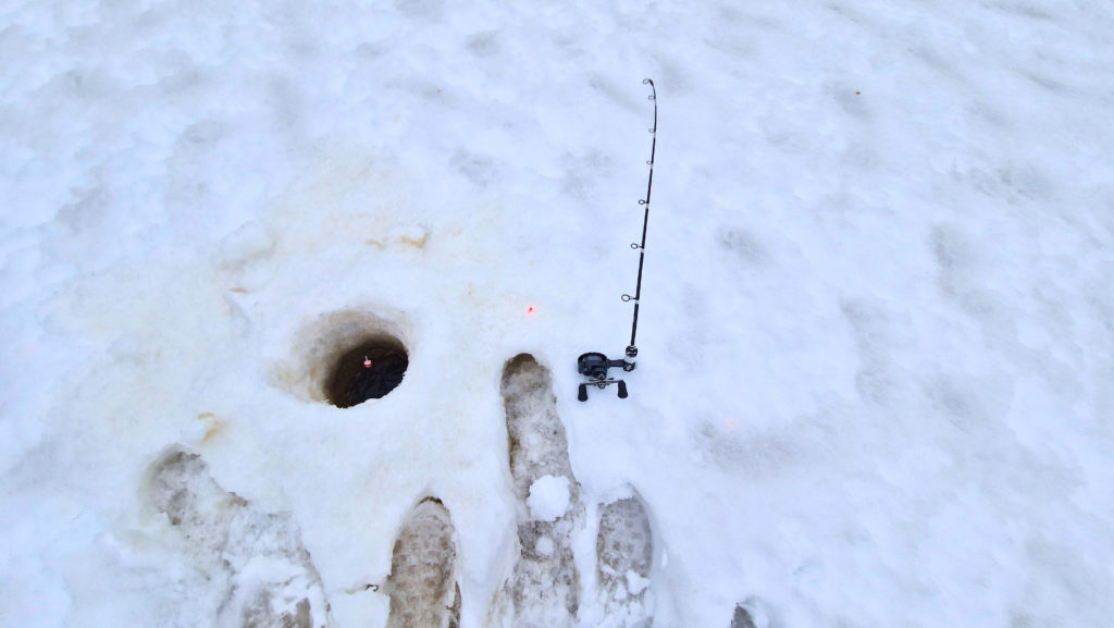 Avannon viereen jäälle lapettu pari metriä löysää siimaa ja avoimeksi jätetty kela varmistavat, että kirjolohi ei hylkää syöttiä.