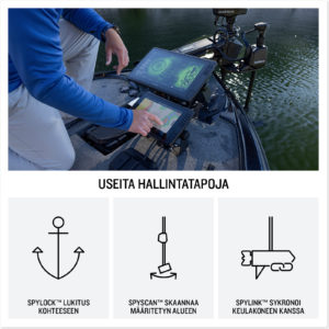 Kun liikutaan ja löydetään mielenkiintoinen kohde, vaatii sen seuraaminen jatkuvaa anturin kääntämistä. Kun kalastaja lukitsee LiveScope-keilan esim. pohjassa olevaan puupinoon, SpyLock™ pitää anturin suunnattuna kohteeseen riippumatta siitä, miten vene liikkuu tai pyörii. Moottoroitu teline korjaa suuntaa reaaliajassa, jolloin kohde pysyy näytöllä ilman, että kalastajan tarvitsee koskea 360-kääntimeen.