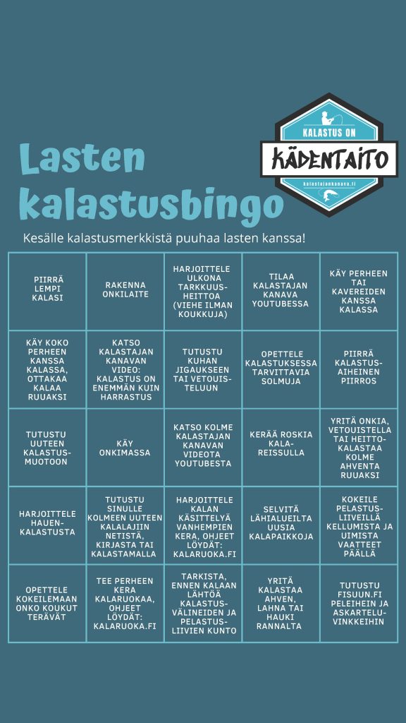 Kalastusbingolla kannustamme perheitä kalaan ja kokeilemaan erilaisia kalastustehtäviä pitkin kesää yhdessä lasten kanssa. Kesän alkuun olemme tehneet perheille käyttöön kalastusbingon. Klikkaamalla kuvaa, saat bingosta tulostettavan pdf-version. Tehkää bingon kalastustehtäviä pitkin kesää ja kun saatte vaakaan, pystyyn tai vinottain 5 suoritusta kasaan – teillä on kalastusbingo! Ottakaa kuva kalastustilanteesta lapsen kanssa ja tägätkää Kalastajan Kanava somekanavissa ja kirjoittakaa #kalastusbingo. Kalastajan Kanava palkitsee parhaita kuvia tuotepalkinnoin kesän lopussa. Kuvia voi myös lähettää osoitteeseen info(at)kalastajankanava.fi. Osallistuja antaa luvan Kalastajan Kanavalle jakaa näitä kuvia omassa viestinnässään. Toki bingon jättipotinkin voi suorittaa, eli kalastusbingon kaikki tehtävät – onhan meillä pitkä kesä tiedossa.