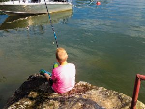 - Tehkää yhdessä ennalta kalareissun pelisäännöt vaikka jääkaapin oveen: pelastusliivit aina veneessä, miten pitää käyttäytyä veneessä, laiturilla, rannassa, vapakädessä, jne., jotta turvallisuusasiat tulevat käsiteltyä ja lapsi oppii ne. Tämä on kivaa yhteispuuhaa, johon vanhemmatkin lapset mielellään osallistuvat kertoen omia oppejaan.