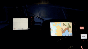 Merellä elektroniikalla on turvallisuuden kannalta tärkeä rooli. Tässä kuvassa lämpökameran näkymä vasemmalla, keskellä kartta, jonka päällä näkyy tutka ja oikeassa reunassa autopilotin säädin.