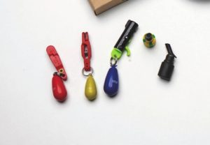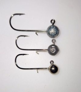 Ylhäältä katsoen 5 g: jigipää eri materiaaleista: sinkki, lyijy, volframi