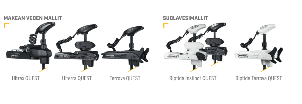 Suosittuihin Minn Kota Ultrex-, Ulterra-, Instinct-, Terrova-, and Riptide Terrova -moottoreiden rinnalle tulee tehokkaammat Quest-mallit. Näissä hyödynnetään hiiliharjatonta 24/36V -Dual-moottoria. Yhtiön mukaan hiiliharjattoman moottorin ansiosta toiminta-aika pitenee jopa 30 % yhdellä latauksella ja 50 % suurempi vääntö mahdollistaa paremman kontrollin tuulessa ja aallokossa sekä tehokkaamman ruovikossa etenemisen.