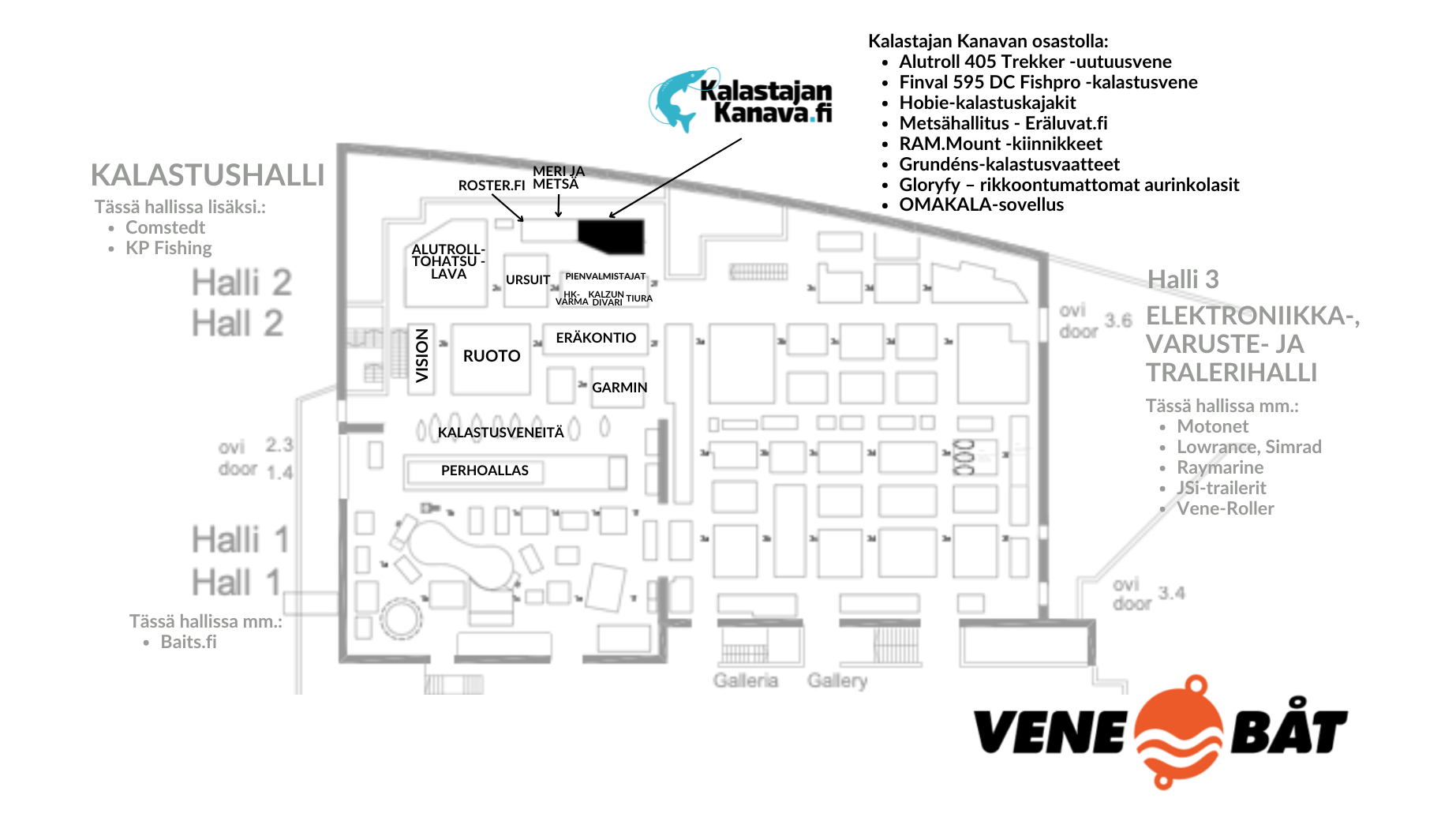 Viime vuosina 5-halli on ollut kiinni ja elektronikka ja varusteet alakerran 3. hallissa. Tänä vuonna yläkerran 5-halli on varattu ensimmäisenä viikonloppuna Helsingin Erämessuille. Erämessuilla on tarjolla metsästystä ja eräilyä. Kalastus säilyy alakerran 2-hallissa. Pääset samalla sisäänpääsylipulla Erämessuille kuin Vene-messuille, mutta muista Erämessut on auki vain 7.-9.2.2025.