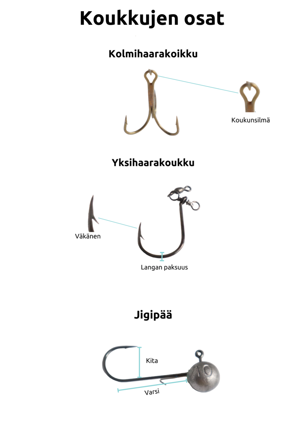 Eri kalastusmuotojen koukkukokoja: