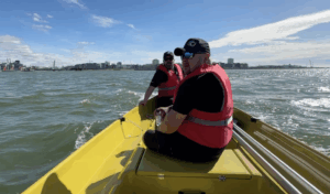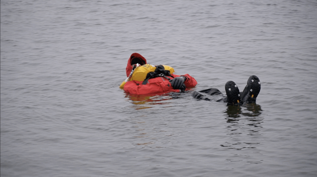 Paukkuliivejä testaamassa vedessä. Aina kun paukkulivien patruuna vanhenee, kannattaa käydä kokeilemassa vedessä miltä tuntuu, kun paukkuliivit poksahtavat ja sitten asentaa uudet patruunat liiveihin. Kun asiaa on harjoitellut, tositilanteessa on paljon paremmat valmiudet toimia.