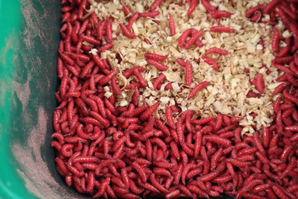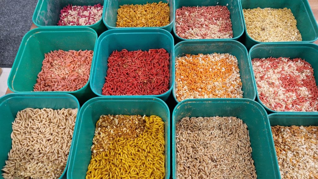 Kokeilunhaluiselle pilkkijälle kärpäsen toukkia on tarjolla monissa eri väreissä.