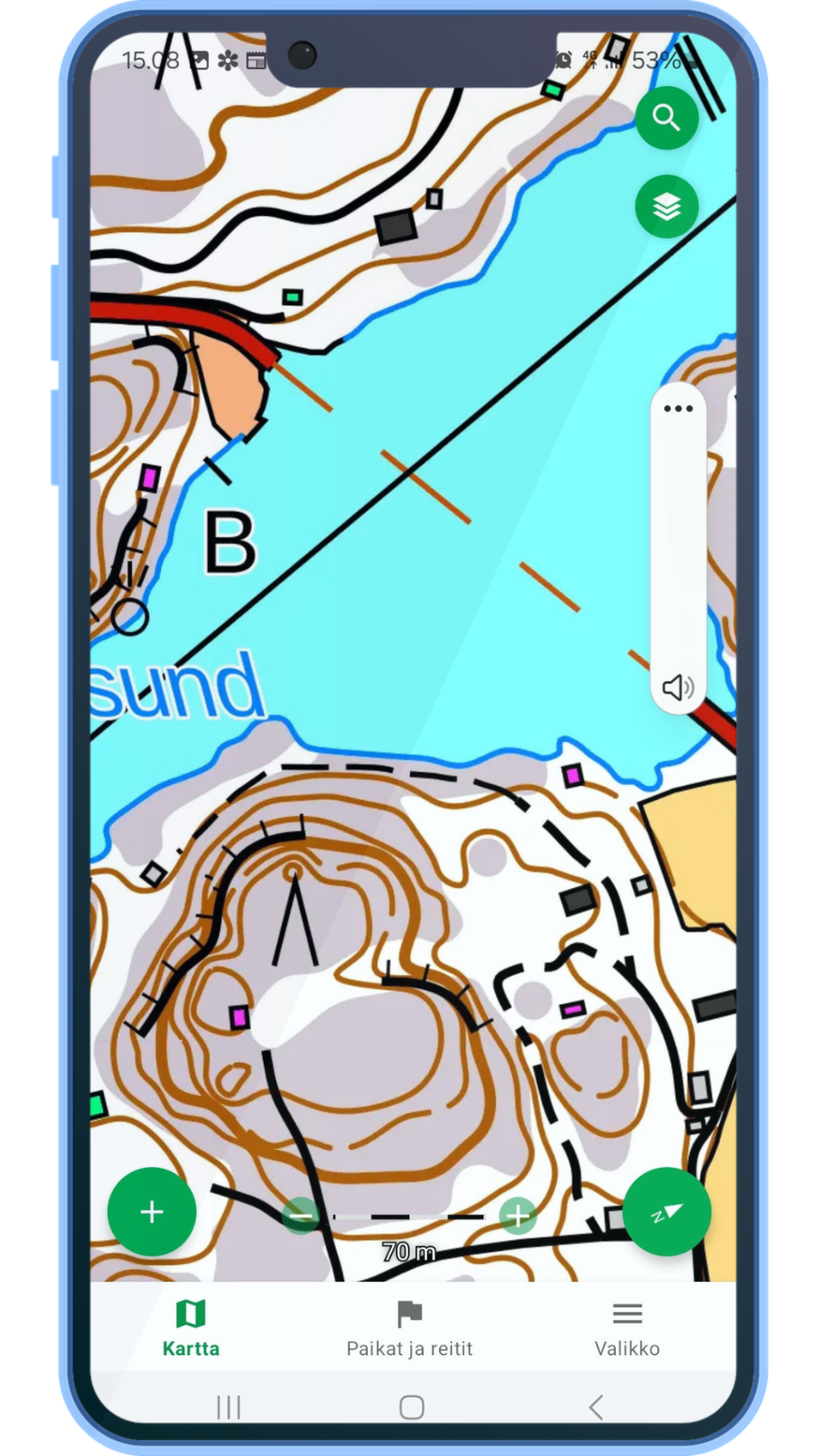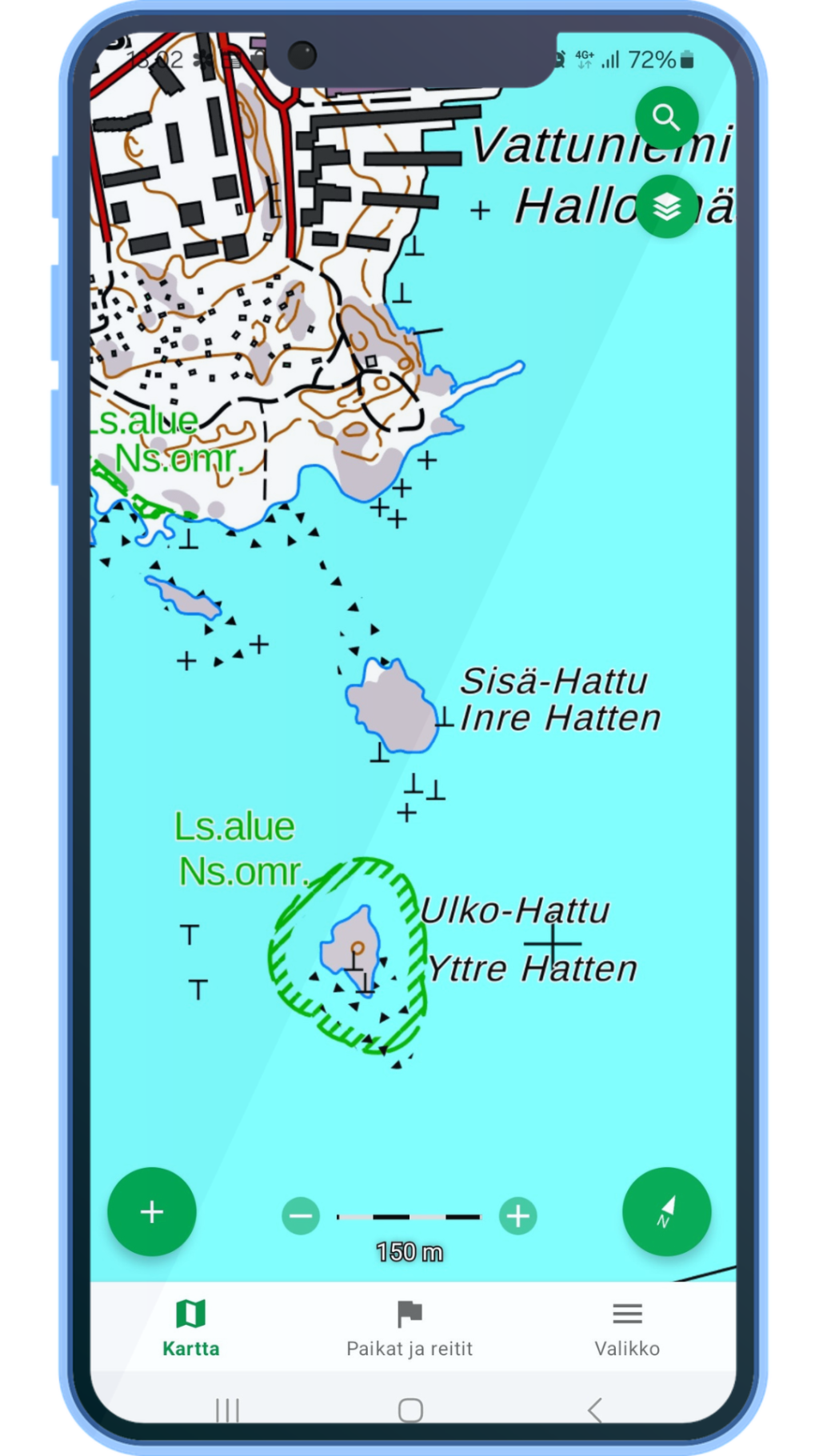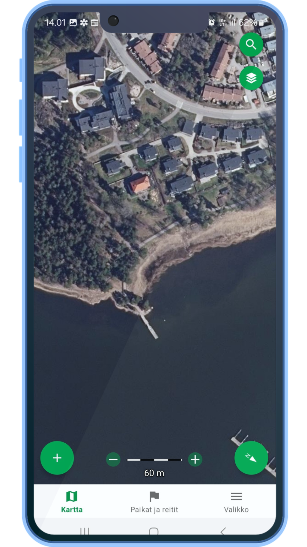Karttaselaimesta pystyy tutkimaan myös rakennuksia. Karttaselaimen Plus-versiosta löytyvät kiinteistöjen rajatkin. Mökit ja mökkirannat jätetään rauhaan, vaikka kalaan olisi kovempikin himo.
