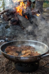 “Hyvä ruoka, parempi mieli”, sanottiin jossain mainoksessa, ja siinä osutaan kyllä aivan oikeaan. Kuivamuonasta, johon lisätään vain vesi, saadaan kyllä energiaa, mutta makunautinto on niin ja näin – eli kuivamuonat menevät osastoon kärsimysnäytelmä. Hyvällä kaasukeittimellä ja oikealla pannulla loihdit kalat, lihat ja kanat, kuten muutkin omaan makuun sopivat sapuskat mukavasti. Koska harrastamme retkeilykalastusta, kalat tietysti pyydämme itse. Jos meistä riippumattomista syistä kalaa ei päädykään ruokalistalle, kannattaa aina mukana olla jotain senkin mustan hetken tilalle (esim. teemaan sopivia särkisäilykkeitä). Kalastukseen tulee kyllä kiva pieni lisämauste, kun ne ruokakalat pitää oikeasti saada.