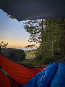 Meillä pääasiallisena majoitteena toimivat riippumatot, jotka on suunniteltu retkeilyä varten. Ei siis sekoiteta retkeilyyn sopivia riippareita takapihalla oleviin riippumattoihin, jotka on tehty ihan eri tarkoitusta varten. Retkeilyyn tarkoitetut riippumatot on varustettu hyttysverkolla, ja päälle tulee tarppi sateelta suojaamaan. Riippumatto on helppo ja nopea kasata sekä purkaa, kun kaikki tarvikkeet kulkevat helposti samassa paketissa.