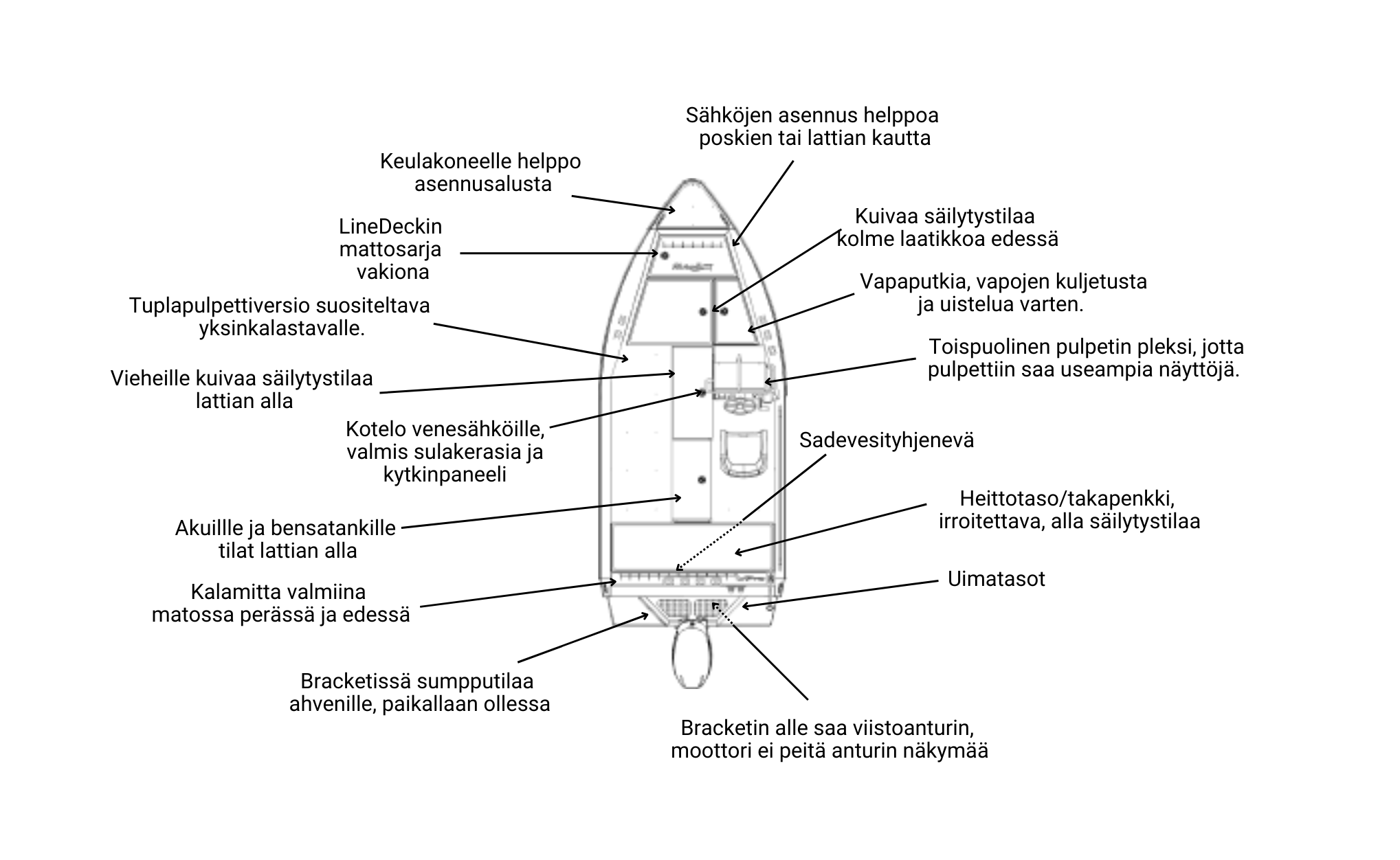 Tässä veneessä on siis paljon ominaisuuksia, joita tämän kokoluokan veneessä ei olla totuttu näkemään tai ei ole markkinoilla olevissa veneissä tarjolla lainkaan. Kurkkaa olennaisimmat ominaisuudet alta: