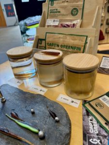 Ehkä kiinnostavimman tuotteen messuilla tarjoili Capt’n Greenfin -niminen sveitsiläisyritys, jonka valikoimassa oli vähän toistakymmentä erilaista proteiinipohjaista, täysin biohajoavaa jigiä. Mukana kaksikolla oli vesiastia, johon jigi oli laitettu kolmisen viikkoa sitten. Jäljellä oli pientä hiutaletta, mutta valtaosin jigi oli liuennut veteen. Pyrstöjen ohella valikoimassa oli myös lyijyttömiä jigipäitä ekologisesta pahviin pakattuna.