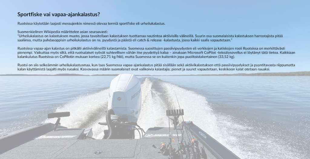 Pyydyskalastuskulttuuri joka tapauksessa elää Suomessa selvästi vahvempana, joten verkko- ja katiskaveneiksi varmasti ostetaan perinteisiä lasikuituveneitä mieluummin kuin isolla rahalla varusteltuja heittokalastusveneitä.