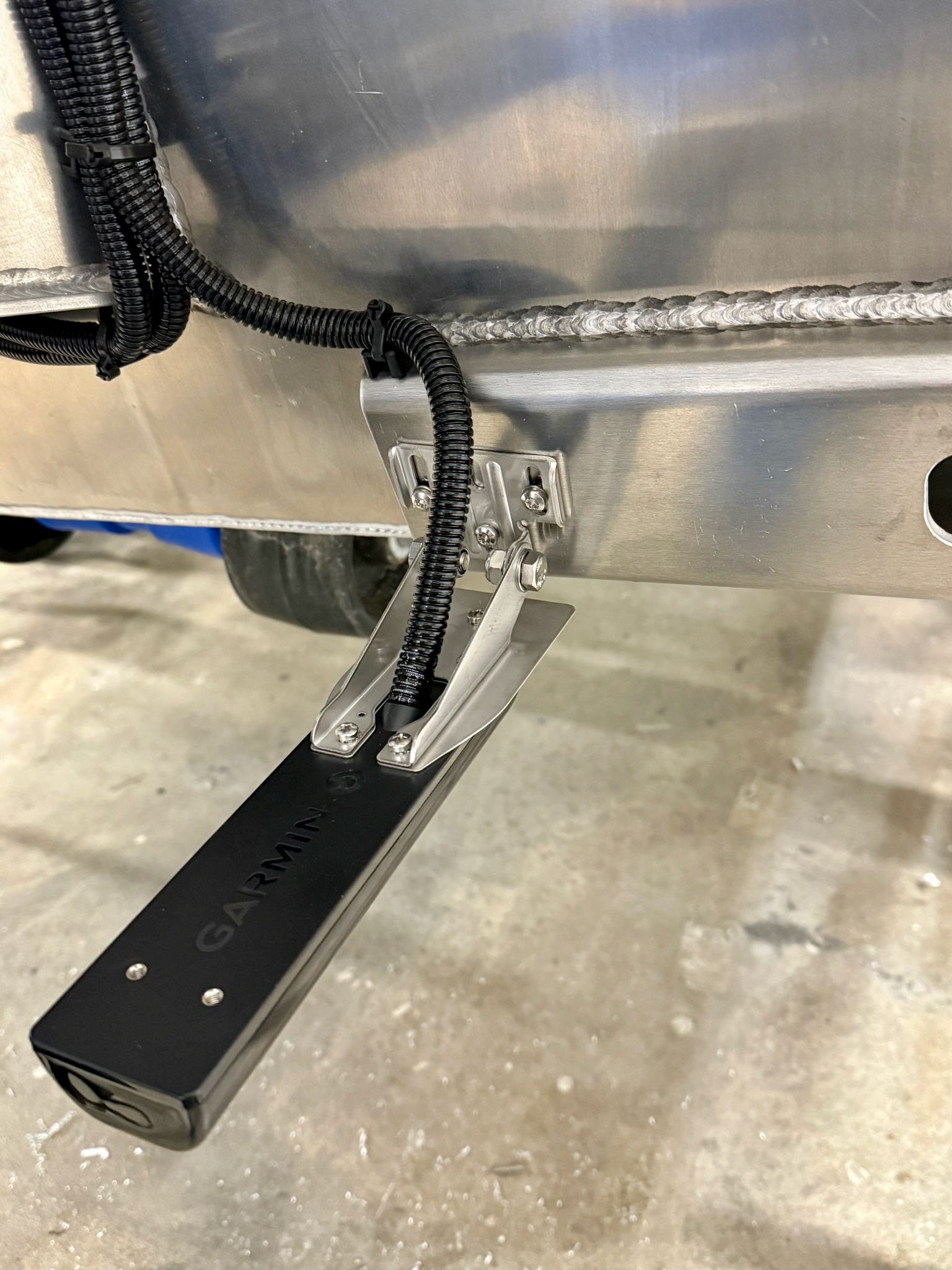 Veneen peräpeiliin asennettiin 2 kappaletta eri kaikuantureita. GT56-viistokaikuanturi (jollainen löytyy myös kiinteänä keulakoneesta) sekä Garmin PS30-anturi, joka saatiin asennettua erinomaiseen paikkaan moottorin etupuolelle braketin alle. Kun moottori on hieman ulompana antureista, auttaa se esteettömän luotainsignaalin saamiseen ja edesauttaa parempaan kaikukuvaan.