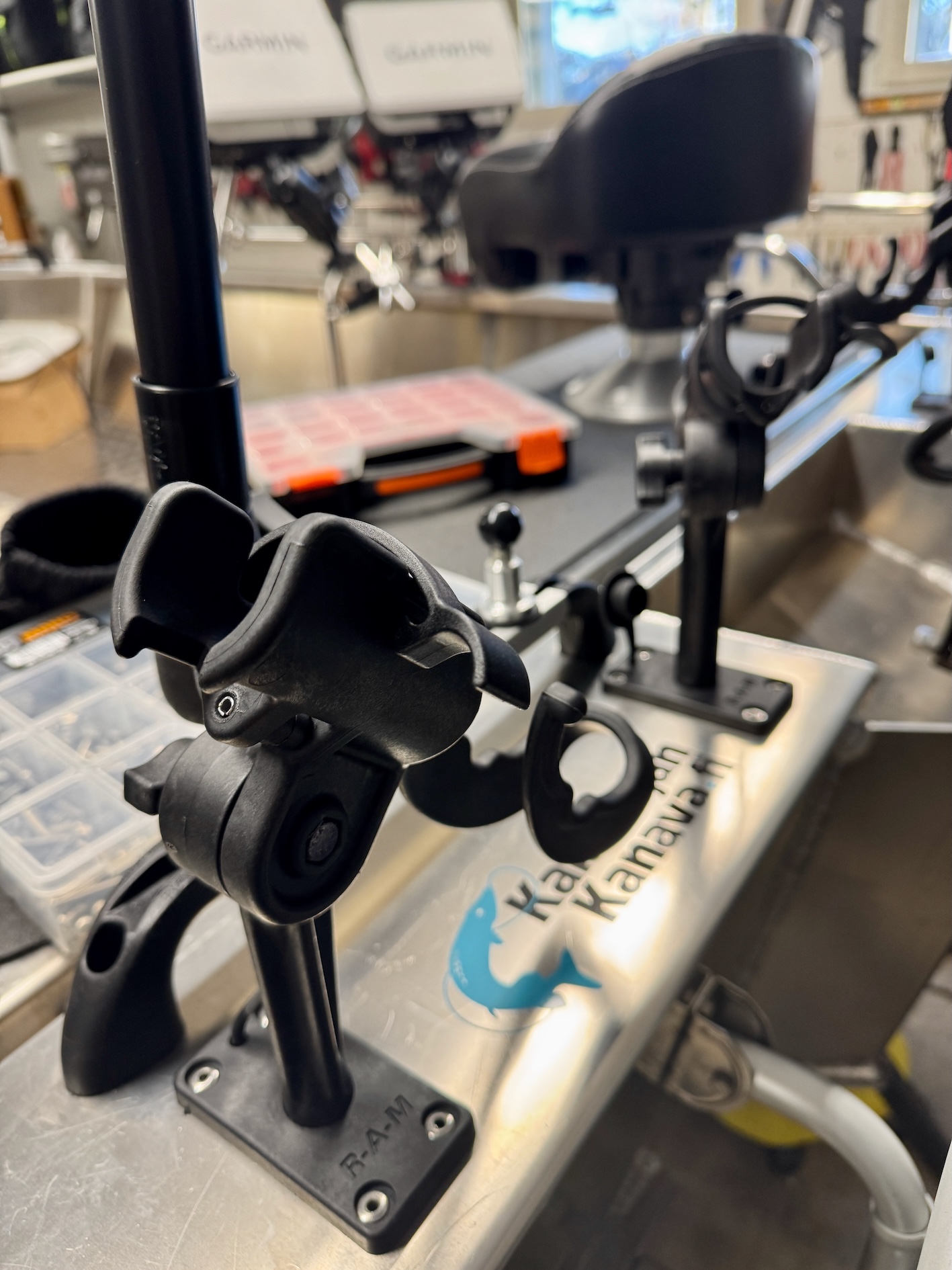 Kuskin eteen asennettiin näppärä RAM Mount -puhelinteline ja samanmoinen laitettiin myös keulaan. Keulakaiteet korvattiin RAM Mount -kaidekiskoilla, joihin saa näppärästi B- ja C-sarjan palloja esim. kameroille, vapatelineille, jigitauluille tms.