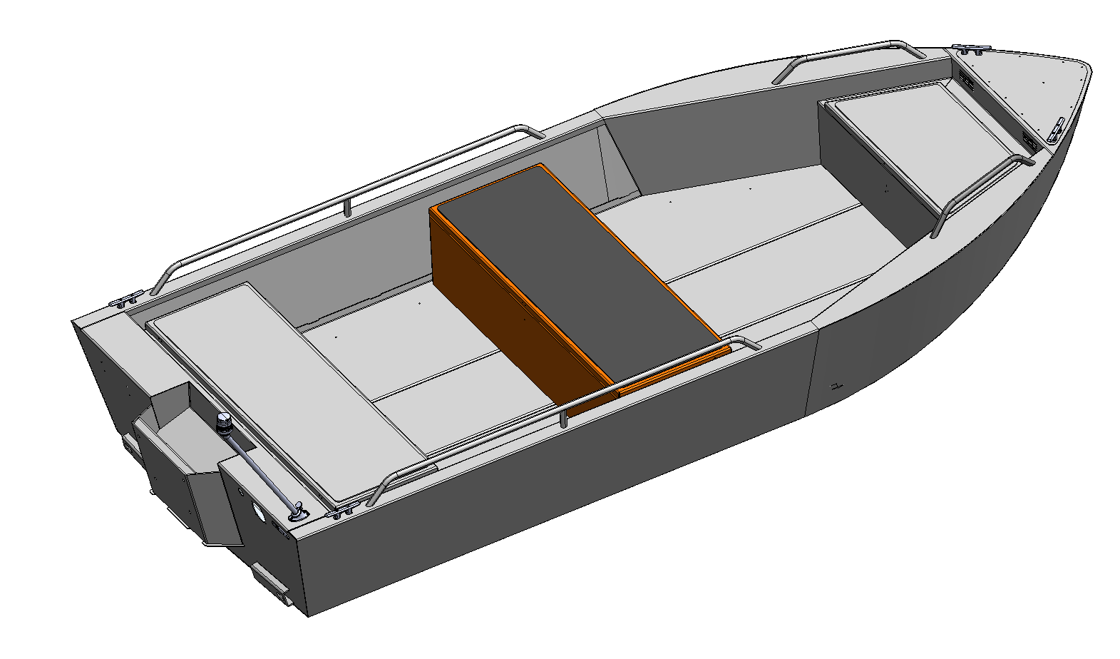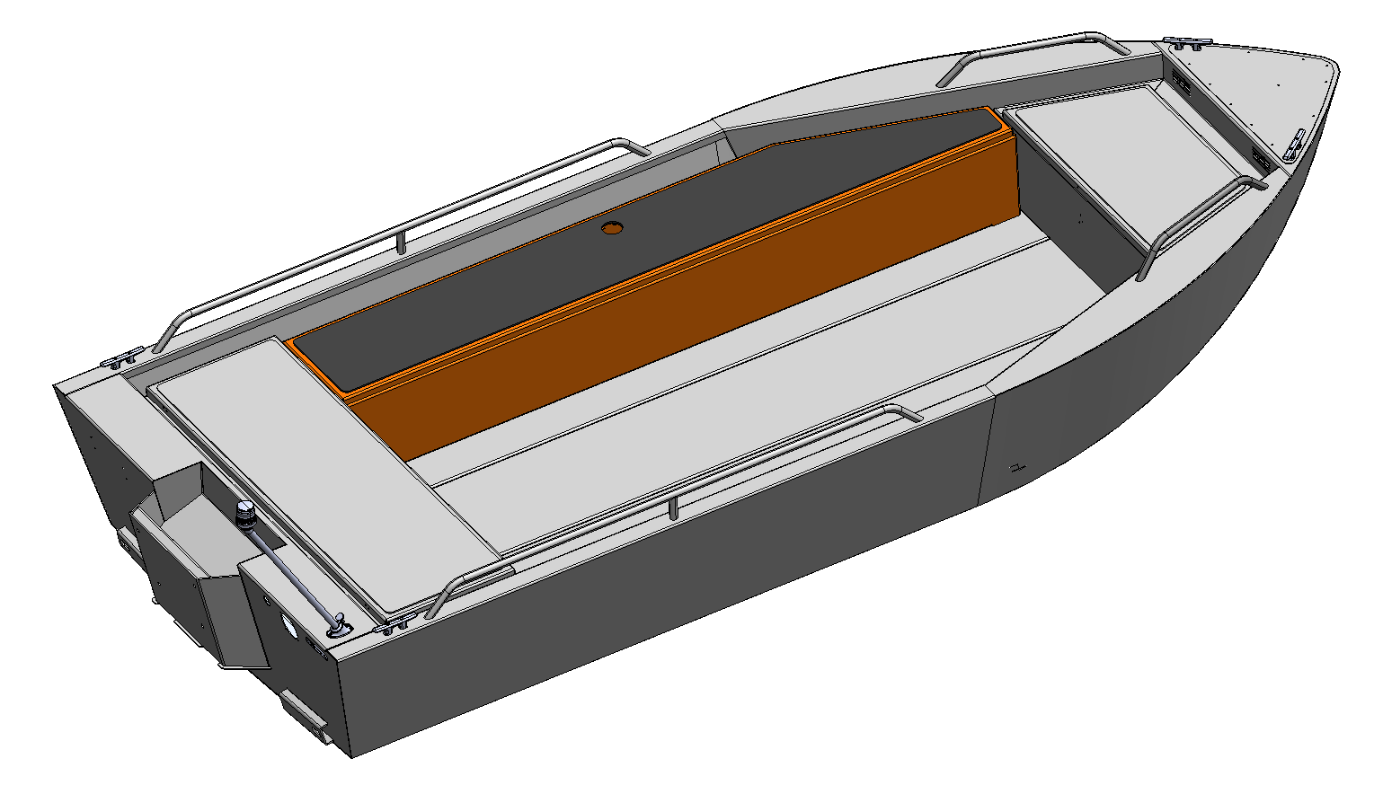 Takapenkin alunen on todella tilava, sinne on helppo asentaa laajatkin varusteet tukevasti ja helposti turvaan, kun laatikko on lukittavissa. Veneen tukevat kaiteet mahdollistavat varustelun helposti esim. Rosterin vapaputkilla tai RAM-kiinnikkeiden kautta luotaimien näytöille, puhelintelineille tms. Lisäksi sileät pinnat heti kuskin takana, mahdollistavat helposti esim. upotettavat vapaputket tai vaikka takilanjalustat, lisäkaiteet jne.