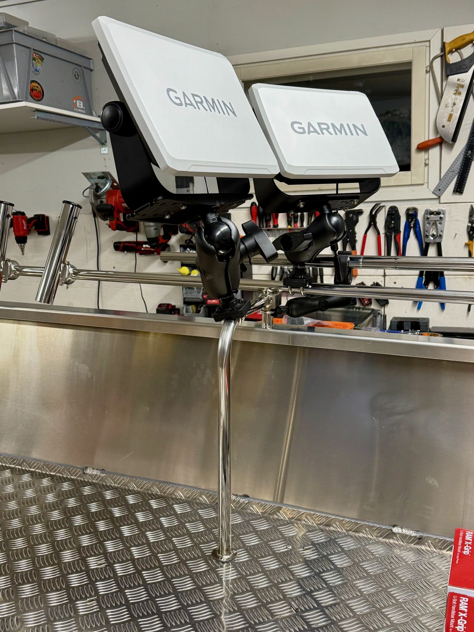 Toinen muokkaus oli Alutrollin tehtaalta lisävarusteena hankittu tukikaide, joka jäykistää sivukaiteen ja tuo pienen 20 cm laidasta ulospäin tulevan lisäkaiteen. Tähän oli helppo asentaa RAM Mount D-sarjan kiinnikkeellä toinen kipparin yhdistelmälaitteista, joka on Garmin Echomap Ultra 2 12-tuumaisena ja viereen varsinaiseen veneen laitakaiteeseen kiinnitettiin myös RAMilla Echomap Ultra 2 -sarjan 10-tuumainen näyttö LiveScope-käyttöön.