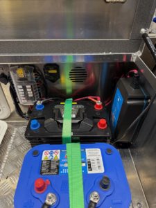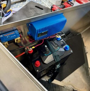 Keulakoneen akun tilanseurantaa varten keulalaatikkoon laitettiin myös Victronin Smart Shunt, jonka kautta saadaan Victron Connetct apsiin akun kulutustietoja. Akun lataaminen tapahtuu kiinteästi keulaboksiin asennetulla Victron Blue Smart IP67 24V/8A -laturilla.
