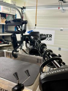 Keulaan pultattiin kiinteästi Garmin Kraken -keulasähkömoottori, uutena lyhyellä 48-tuuman rikiputkella varustettuna. Lisäksi asennettiin Echomap Ultra 2 -telakka, jossa voidaan tarvittaessa käyttää Kalastajan Kanavan Hobie Pro Angler 360 -kajakissa olevaa näyttöruutua. Echomap-sarjan telakat ja irroitettava näyttö mahdollistavat kierrätyksen erinomaisesti, eikä telakka + toiset virta- ja verkkojohto ole lisäinvestointina kovinkaan kalliita. Koska veneeseen tuli 2 näyttöä, varaus sekä 2 liveluotain-moduulia, loppui näytöistä verkkopiuhojen paikat. Tästä syystä takapenkin alle asennettiin Garmin GMS10-ethernethub, jolla saadaan kaikki laitteet samaan verkkoon.