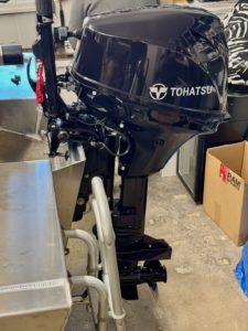 Kalastajan Kanavan veneessä on perämoottorina 20 hevosvoimainen Tohatsun kahvaohjattava tiller-mallin perämoottori (MFS20EEFTL), jossa on sähkökäynnistys. Moottori on varsin kevyt, painaen 43 kiloa (jopa 10 kiloa vähemmän kuin moni muu saman kokoluokan moottori). Moottorissa on sähköisesti ohjattu polttoaineensyöttö (EFI), joten moottori käynnistyy helposti kaikissa olosuhteissa ja on todella pienikulutuksinen. Ja mikä on varsin huikeaa Tohatsu myöntää moottoreilleen jopa 7 vuoden takuun. Tohatsun moottorin värin saa itse myös valita: AQ=Aquamarine sininen, BW=Beluga valkoinen – molemmat ovat vakiovärejä, joten väri ei vaikuta hintaan. (Huomaa, että tarjouspyyntölaskurin perämoottorimallissa ei ole power tilt -toimintoa, joten ota MFS20EEFTL, jos sen haluat.)