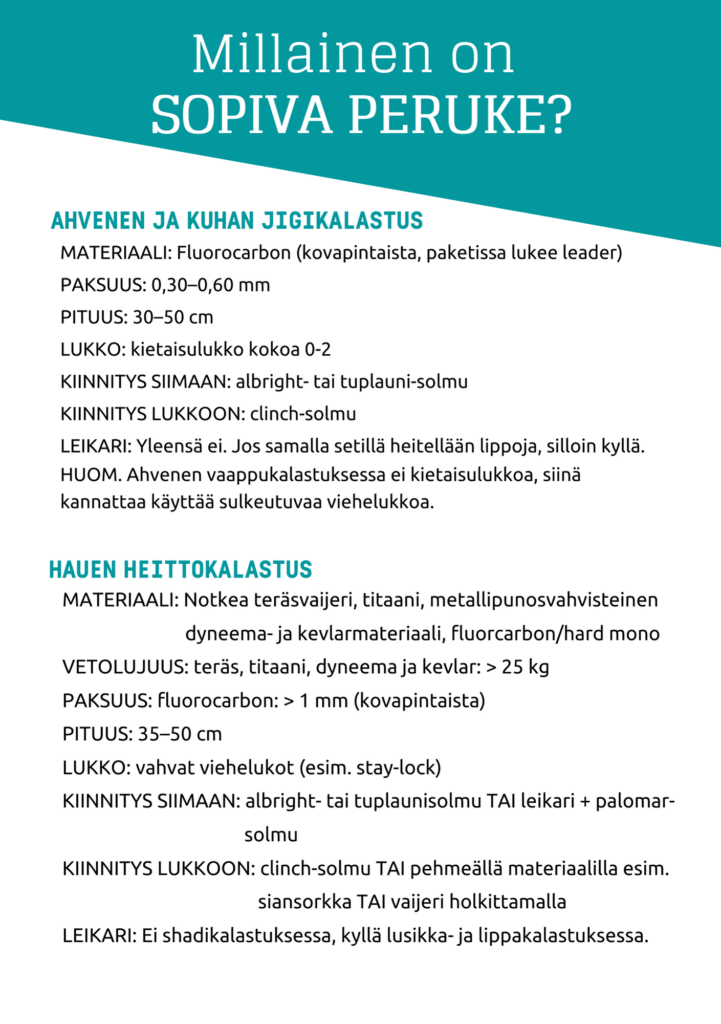 Perukemateriaaleja on pääsääntöisesti neljä erilaista: fluorocarbon (fluorihiili), teräs, titaani sekä erilaiset dyneeman ja teräsverkon yhdistelmät. Perukemateriaali ja perukkeen pituus kannattaa valita kalastusmuodon ja kalastettavan lajin mukaan. Oheiseen taulukkoon olemme pyrkineet laittamaan suuntaa-antavat vinkit sopivan perukkeen tekemiseksi yleisimmille petokaloille.