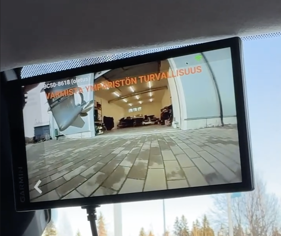 Testasimme ensin lähetintä samalle etäisyydelle autosta kuin kameraa, mutta tällöin Wi-Fiin perustuva kuvan toimitus navigaattoriin pätki, joten siirsimme lähettimen trailerin renkaan kohdille. Näin saimme yhteyden toimimaan luotettavasti. Näyttönä peruutuskameralle autossa toimi Garmin Drive Smart 66 -navigaattori.