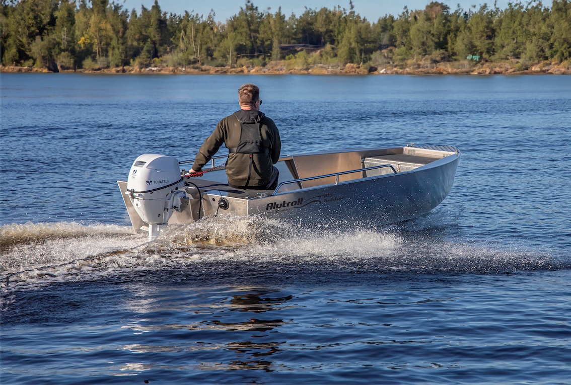 Alutroll 405 Trekker -veneen saa tiller- eli kahvaohjattavana sekä ratti- eli pulpettiversiona. Kuva: Alutroll